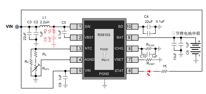 RX6103 是一款 5V USB 输入,最大 1.6A 充电电流,支持三节锂电池串联应用的同步升压充电管理芯片,采用同步开关架构,使其在应用时仅需要极少的外围器件,RX6103 的升压开关充电转换器的工作频率为 500KHz,转换效率为 95%。RX6103 具备涓流充电、恒流充电、恒压充电、自动截止、自动再充电等一套完整充电循环的充电管理芯片。