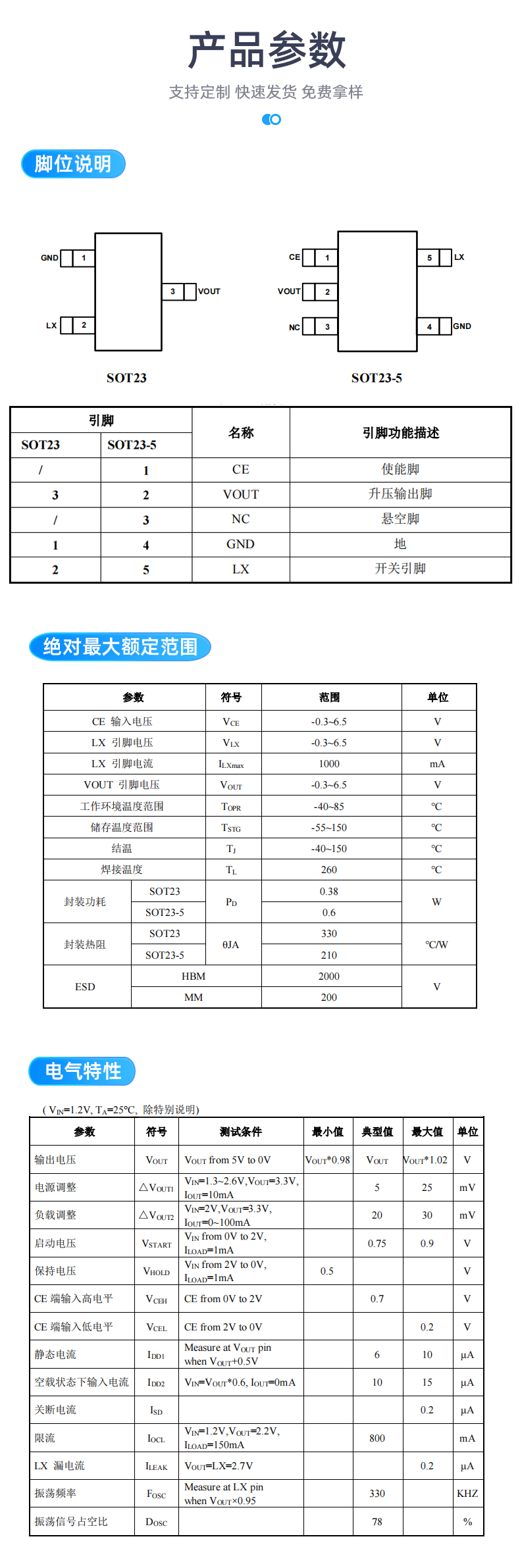 封装采用SOT23和SOT23-5。芯片有内置 开关晶体管,外围仅需要电感和电容,就可 以完成低输入电池电压升压到所需的工作电 压。