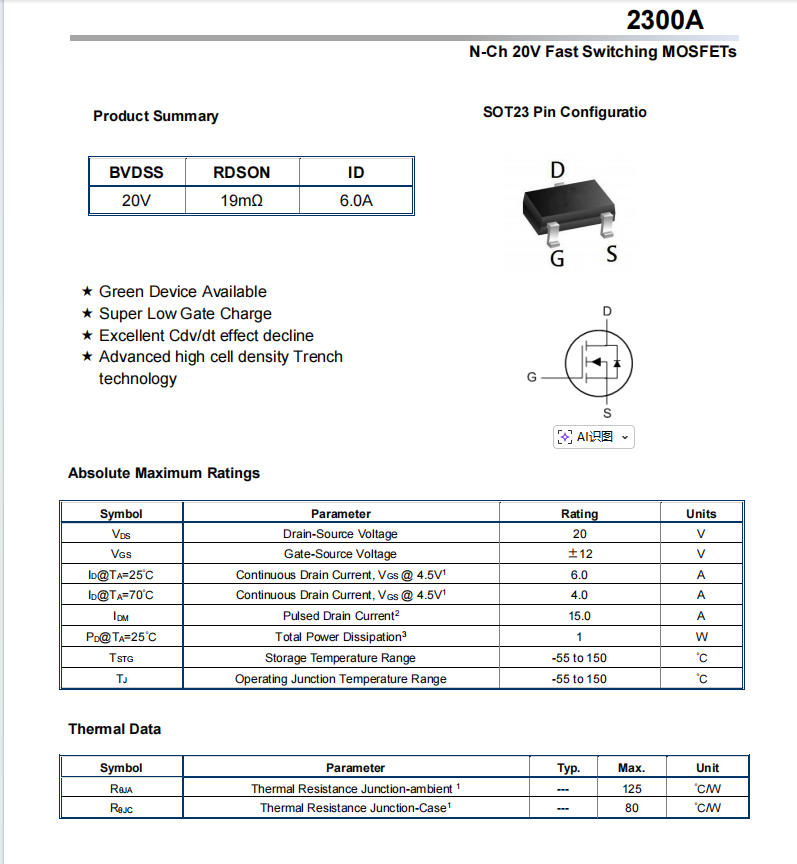 产品特性:NMOS;BVDSS:20V;ID:6A;RDS(ON):19mΩ